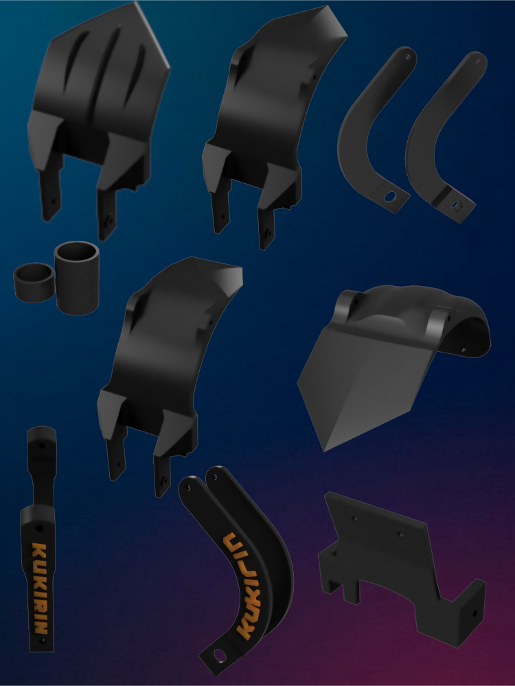 Első hegyes sárvédő, Első szögletes sárvédő, Első "3 uszonyos" sárvédő, Hátsó hegyes sárvédő, Hátsó szögletes sárvédő, 1 pár első egyszínű merevítő (fekete), 1 pár hátsó egyszínű merevítő (fekete), 1 pár első feliratos merevítő (fekete alap, narancssárga felirat), 1 pár hátsó feliratos merevítő (fekete alap, narancssárga felirat), Távtartó gyűrűk első kerékhez, TPU Konzol