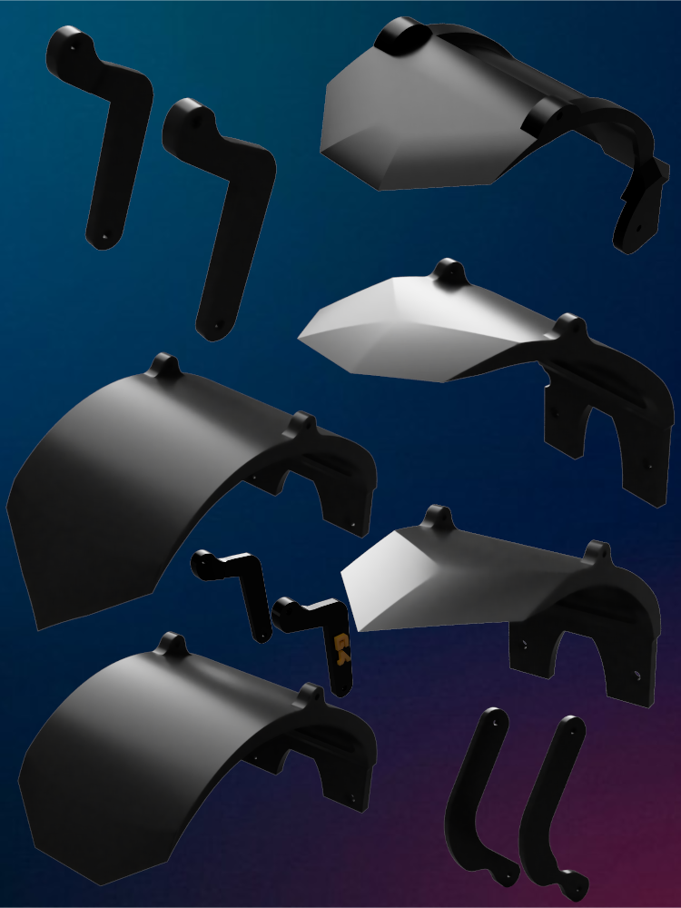 Első hegyes sárvédő, Első szögletes sárvédő, Hátsó hegyes sárvédő, Hátsó szögletes sárvédő, Hátsó hosszú hegyes sárvédő, Hátsó hosszú szögletes sárvédő, 1 pár első egyszínű merevítő (fekete), 1 pár hátsó egyszínű merevítő (fekete), 1 pár első feliratos merevítő (fekete alap, narancssárga felirat), 1 pár hátsó feliratos merevítő (fekete alap, narancssárga felirat)